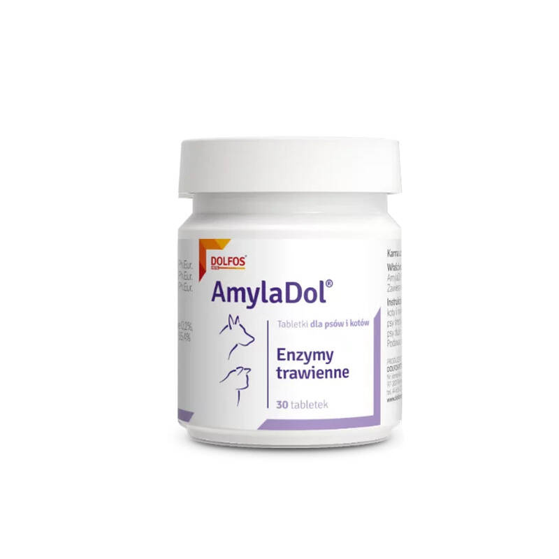 AmylaDol to preparat dla psów i kotów zawierający naturalne enzymy trawienne. Wyrównuje zaburzenia trawienia. Zalecany przy zewnątrzwydzielniczej niewydolności trzustki.