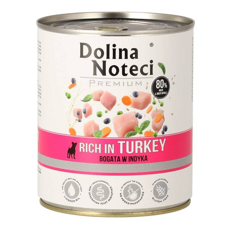 Karma Dolina Noteci Premium bogata w indyka jest pełnoporcjową karmą przeznaczoną dla dorosłych psów wszystkich ras, pokrywającą w 100% ich dzienne zapotrzebowanie na wszystkie składniki odżywcze, w tym również witaminy i minerały. Dzięki dodatkom surowców stanowiących źródło substancji biologicznie czynnych, karma stanowi ciekawe rozwiązanie w żywieniu dorosłego psa, zgodne ze współczesnymi zaleceniami żywieniowymi. Szczególny nacisk został położony na utrzymanie prawidłowej proporcji między wapniem a fosforem.