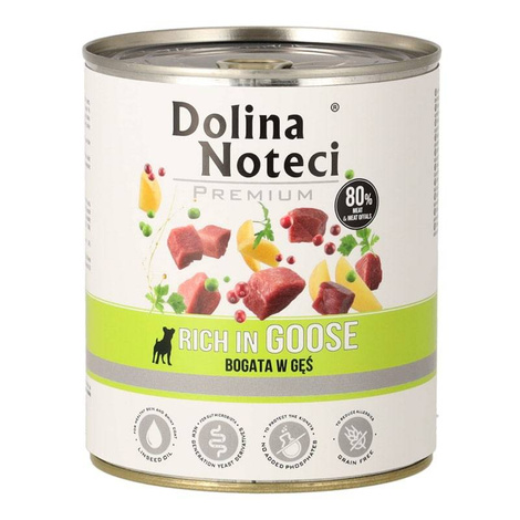 Karma Dolina Noteci Premium bogata w gęś jest pełnoporcjową karmą przeznaczoną dla dorosłych psów wszystkich ras, pokrywającą w 100% ich dzienne zapotrzebowanie na wszystkie składniki odżywcze, w tym minerały i witaminy. Szczególny nacisk został położony na utrzymanie prawidłowej proporcji między wapniem a fosforem. Skład surowcowy został tak skomponowany, aby dieta zawierała fosfor tylko w formie organicznej, która naturalnie występuje w produktach pochodzenia zwierzęcego i roślinnego. Dzięki dodatkom surowców stanowiących źródło substancji biologicznie czynnych, karma stanowi ciekawe rozwiązanie w żywieniu dorosłego psa, zgodne ze współczesnymi zaleceniami żywieniowymi. Wykorzystanie wysokiej jakości mięsa i podrobów z wołowiny, gęsi i wieprzowiny dostarcza psu odpowiednich składników odżywczych. Surowce pochodzące z gęsi zawierają łatwostrawne białko bogate we wszystkie aminokwasy egzogenne oraz tłuszcz stanowiący źródło wielonienasyconych kwasów tłuszczowych z rodziny n-6. Żurawina, poprzez wysoką zawartość procyjanidyn o silnych właściwościach przeciwutleniających, chroni komórki przed negatywnymi skutkami stresu oksydacyjnego i hamuje procesy starzenia się. Groszek i ziemniaki stanowią źródło włókna pokarmowego, dostarczającego niezbędnej ilości węglowodanów potrzebnych do efektywnego przeprowadzenia przemian metabolicznych pozostałych składników odżywczych. Natka pietruszki dzięki wysokiej zawartości prowitaminy A pozytywnie wpływa na stan skóry czworonoga. Nasiona babki płesznik oraz nowej generacji produktów drożdży (w których zastosowano połączenie trzech inaktywowanych szczepów drożdży: Saccharomyces cerevisiae AQP 12260, AQP 12988 i Cyberlindnera jadinii AQP 12549 działających synergistycznie) regulują pracę przewodu pokarmowego, dzięki czemu zwiększa się efektywność procesów trawienia i wchłaniania składników odżywczych. Metoda produkcji karmy pozwala zachować wysoką wartość odżywczą świeżych surowców, dzięki czemu produkt jest lekkostrawny, a także charakteryzuje się wysokimi współczynnikami strawności składników odżywczych oraz zachowuje wysokie walory sensoryczne. Przestrzegając zalecanych ilości podawanej karmy, opiekun ma gwarancję odpowiedniego odżywienia psa, bez pojawienia się ryzyka nadwagi i otyłości.