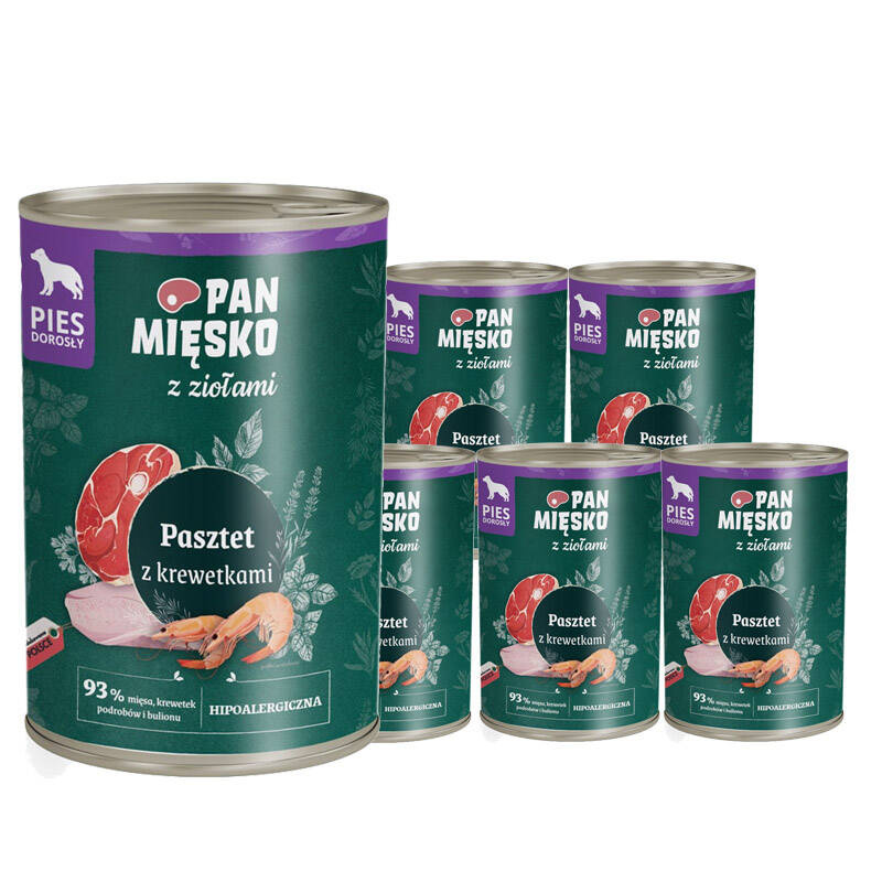 Pan Mięsko karma mokra dla psa z ziołami pasztet z krewetkami zestaw 6 x 400 g