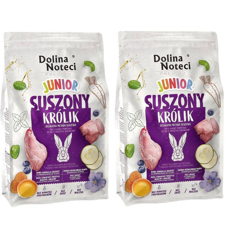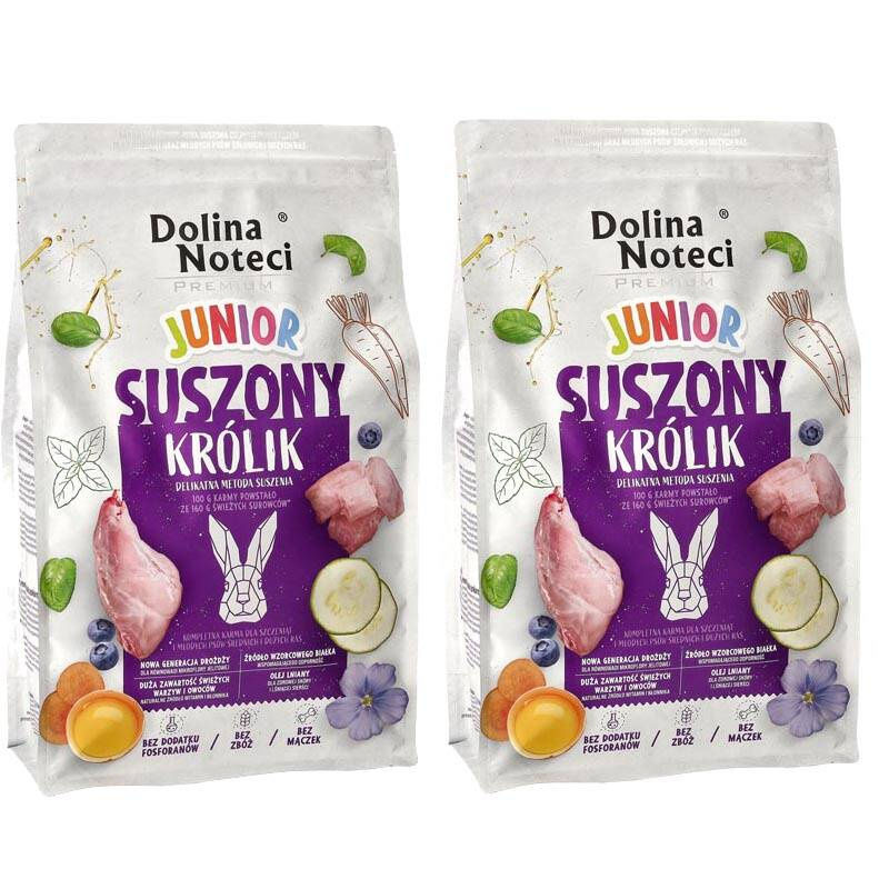 Karma Dolina Noteci Premium Junior -królik to pełnoporcjowa suszona karma bytowa dla szczeniąt oraz młodych psów średnich i dużych ras. Skład karmy pokrywa dzienne zapotrzebowanie na wszystkie składniki odżywcze, w tym witaminy i minerały uwzględniając fazę wzrostu i rozwoju młodych psów. Jej mniej inwazyjna metoda suszenia w niskiej temperaturze zachowuje wysoką wartość odżywczą i biologiczną wszystkich świeżych surowców wykorzystanych w jej produkcji. 80% składu surowcowego karmy suszonej to mięso i podroby z królika, wołowiny, wieprzowiny i dorsza z wyjątkowo wysokim, bo aż 40% udziałem mięśni szkieletowych. Mięso zawiera kreatynę, która jest źródłem energii dla mięśni, przez co stanowi ważny element diety psa.