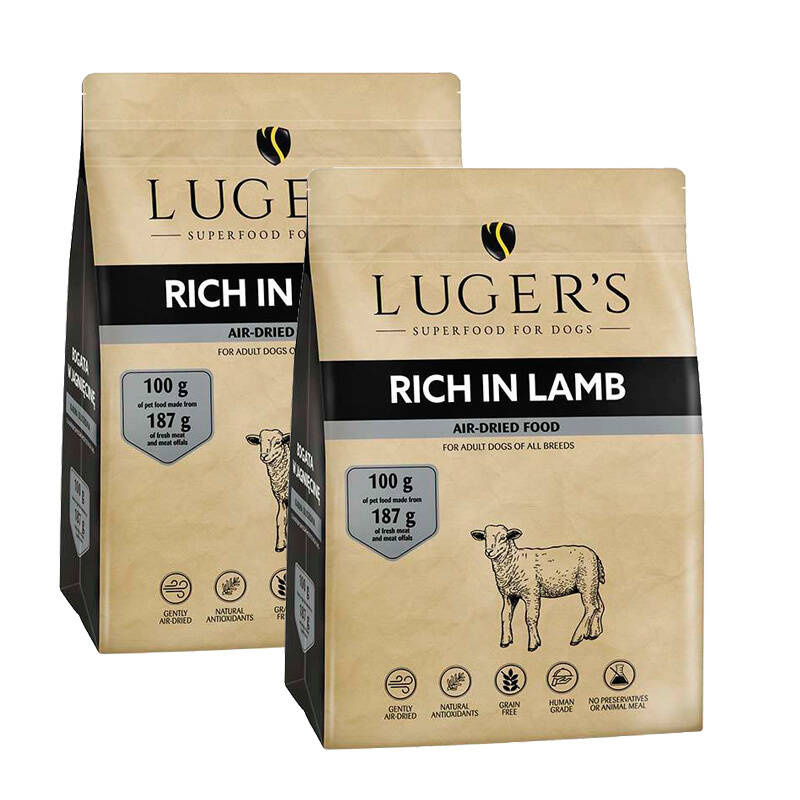 Luger’s bogata w jagnięcinę to pełnowartościowa karma suszona przeznaczona dla dorosłych psów wszystkich ras, pokrywająca ich dzienne zapotrzebowanie na wszystkie składniki odżywcze. Specjalna innowacyjna metoda produkcji polegająca na delikatnym suszeniu oraz odpowiednim doborze surowców sprawia, że karma jest lekkostrawna i idealnie dopasowana do wymogów żywieniowych dorosłych psów. Co więcej, właśnie dzięki suszeniu ciepłym powietrzem, do wyprodukowania 100 g karmy zostało użyte aż 187 g mięsa i podrobów, zachowując przy tym smakowitość oraz wszystkie wartości odżywcze. Urozmaicony i wartościowy skład produktów pochodzenia zwierzęcego z jagnięciny, wieprzowiny i wołowiny i kurczaka, które są źródłem białka, oraz niezbędne aminokwasy, zapewniają różnorodność składników odżywczych i tekstur, które w efektywny sposób stymulują procesy trawienne. Kwasy tłuszczowe z rodzin n-6 i n-3 stanowią doskonałe źródło energii oraz substancji kontrolujących przebieg procesów metabolicznych organizmu psa. Karma została skomponowana pod kątem zawartości wszystkich niezbędnych składników mineralnych, między innymi wapnia i fosforu, które gwarantują prawidłowe współdziałanie układów kostnego i mięśniowego. Dodatek warzyw, babki płesznik, drożdży piwnych oraz rozmarynu reguluje pracę przewodu pokarmowego oraz wpływa na funkcjonowanie wszystkich układów i narządów dorosłego psa. Dbając o przestrzeganie zalecanej ilości podawanej psu karmy, nie ma ryzyka powstania nadwagi czy otyłości.