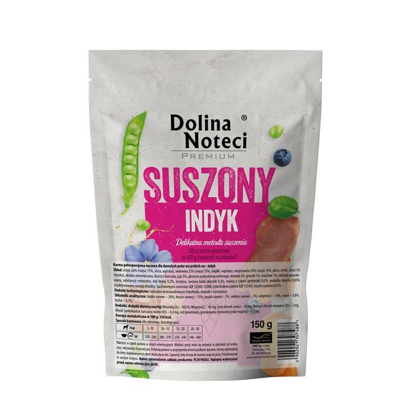 Karma Dolina Noteci Premium -indyk to pełnoporcjowa suszona karma bytowa dla psów wszystkich ras, pokrywając w 100% ich dzienne zapotrzebowanie na wszystkie składniki odżywcze, w tym minerały i witaminy. Jej mniej inwazyjna metoda suszenia ciepłym powietrzem powoduje, że karma zachowuje wysoką wartość odżywczą i biologiczną wszystkich świeżych surowców wykorzystanych w jej produkcji. 80% składu karmy suszonej to mięso i podroby z indyka, wołowiny, wieprzowiny i dorsza z wyjątkowo wysokim, bo aż 40% udziałem mięśni szkieletowych. Mięso zawiera kreatynę, która jest źródłem energii dla mięśni, przez co stanowi ważny element diety psa.