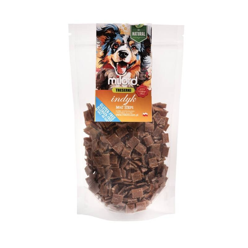 Treningówki te doskonale sprawdzą się dla psów każdej wielkości i mogą być stosowane również jako karma uzupełniająca. Zostały one wyprodukowane wyłącznie z mięsa z indyka, a cały proces produkcji odbywał się w Polsce pod rygorystycznym nadzorem inspekcji weterynaryjnej (MILORD WNI 24168303).