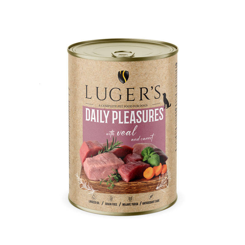 Karma pełnoporcjowa dla dorosłych psów Luger's Daily Pleasures z cielęciną i marchewką pokrywa zapotrzebowanie na wszystkie składniki odżywcze w ilościach i proporcjach rekomendowanych przez nowoczesne normy i zalecenia żywieniowe.
