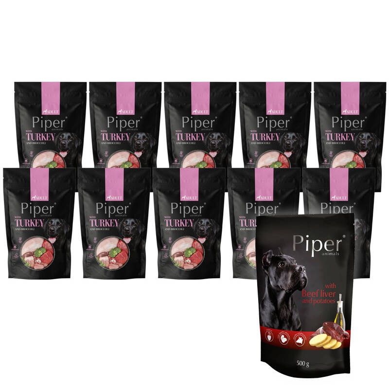 Mokra Karma dla psa Piper Animals z indykiem i brokułem zestaw 10 x 500 g + GRATIS Karma z wątrobą wołową i ziemniakami 500 g