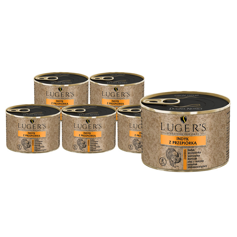 - Luger’s indyk z przepiórką jest pełnoporcjową, mokrą karmą, dedykowaną dorosłym kotom wszystkich ras. Starannie dobrany skład zaspokaja ich specyficzne wymagania żywieniowe.