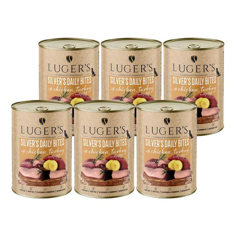 Luger's Silver's Daily Bites z kurczakiem, indykiem i ziemniakiem jest pełnoporcjową mokrą karmą dla starszych psów, która pokrywa zapotrzebowanie na wszystkie składniki odżywcze w ilościach i proporcjach rekomendowanych przez nowoczesne normy i zalecenia żywieniowe, uwzględniając jednocześnie naturalne i fizjologiczne zmiany zachodzące w organizmach zwierząt.