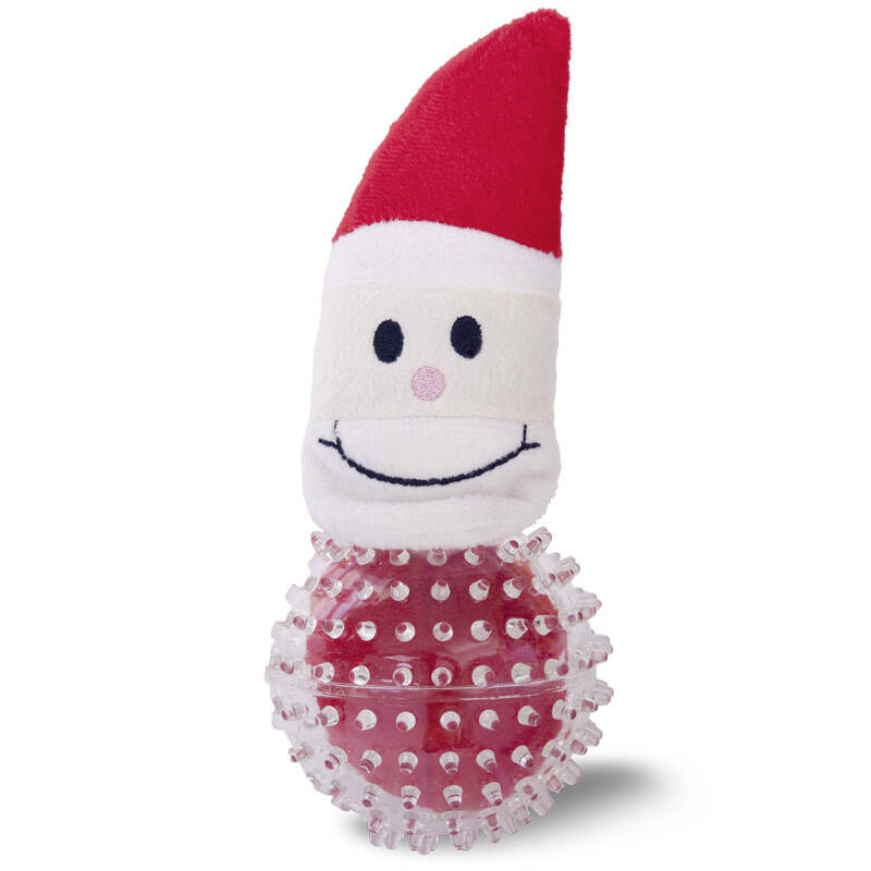 Wytrzymałe piłki o średnicy 8 cm, zaopatrzone w miękkie wypustki, delikatnie masują dziąsła, wspomagając utrzymanie prawidłowej higieny jamy ustnej u psa. Transparentność piłki wypełnionej świąteczną maskotką, sprzyja naturalnemu instynktowi zabawy oraz odkrywania. Ukryta we wnętrzu zabawki piszczałka pobudza ciekawość i wydłuża zabawę.