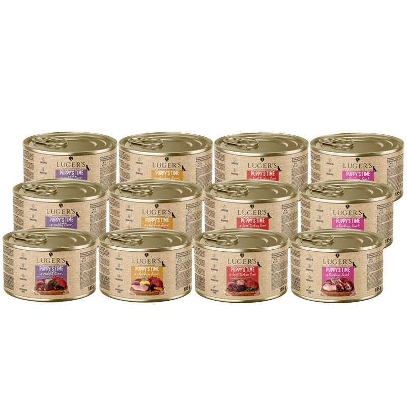 Linia karm mokrych Luger's Puppy’s Time uwzględnia w swoim składzie wszystkie składniki odżywcze, które są niezbędne do zapewnienia prawidłowego wzrostu szczeniąt. Odpowiednie, pełnowartościowe żywienie psów w tym okresie daje gwarancję zdrowia i prawidłowego dalszego rozwoju organizmu. Z tego powodu skład karm Luger's Puppy’sTime został precyzyjnie opracowany zgodnie z zaleceniami żywieniowymi dla tej fazy wzrostu. Użyte do produkcji wysokiej jakości mięso i podroby dostarczają pełnowartościowego białka i niezbędnych kwasów z rodziny n-3 oraz n-6, tak ważnych dla szczeniąt. Odpowiednia gęstość energetyczna karmy oraz proporcje składników mineralnych gwarantują prawidłowy rozwój układu kostnego i mięśniowego. Naturalnym źródłem wielu związków biologicznie czynnych stymulujących funkcje trawienne są drożdże piwne, będące źródłem prebiotyków: mannanooligosacharydów oraz β-glukanów. Sproszkowany sok z buraka, rozmaryn suszony oraz żurawina zwiększają ilość przeciwutleniaczy i substancji pozytywnie wpływających na szereg funkcji rozwijającego się organizmu.