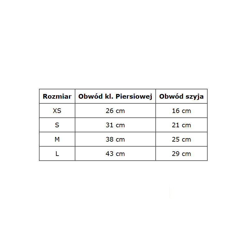 | Rozmiar | Obwód kl. Piersiowej | Obwód szyja |
