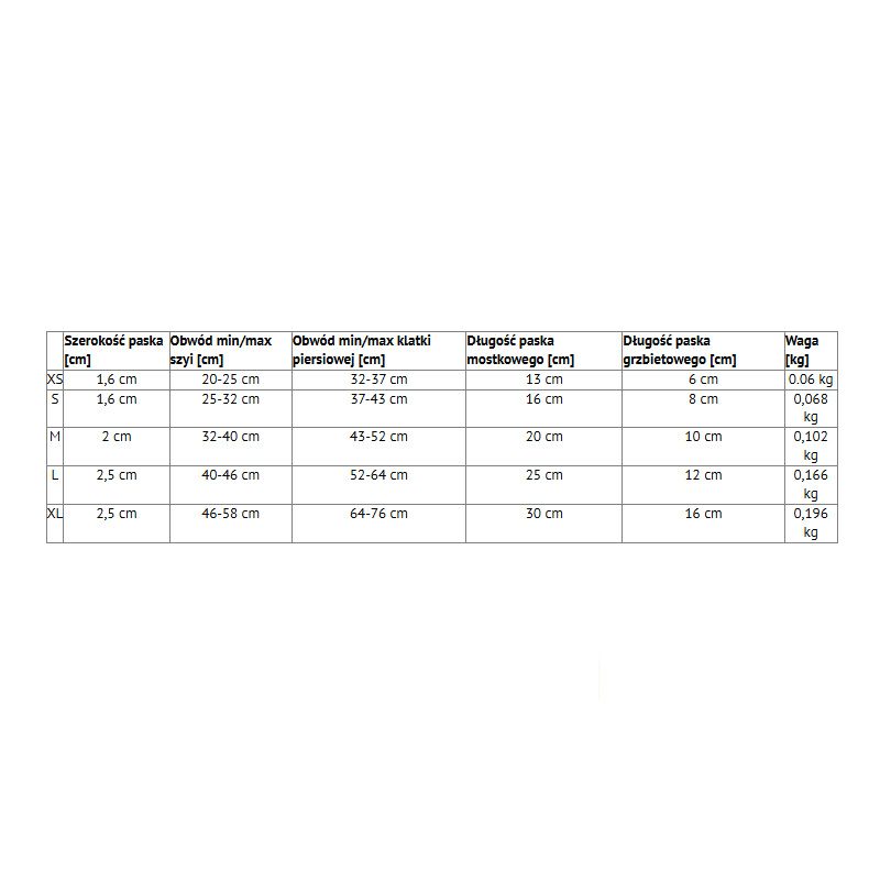 | Szerokość paska [cm] | Obwód min/max szyi [cm] | Obwód min/max klatki piersiowej [cm] | Długość paska mostkowego [cm] | Długość paska grzbietowego [cm] | Waga [kg] | |