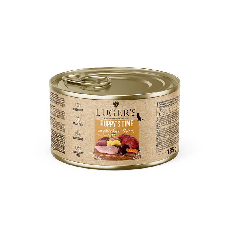 Linia karm mokrych Luger's Puppy’s Time uwzględnia w swoim składzie wszystkie składniki odżywcze, które są niezbędne do zapewnienia prawidłowego wzrostu szczeniąt. Odpowiednie, pełnowartościowe żywienie psów w tym okresie daje gwarancję zdrowia i prawidłowego dalszego rozwoju organizmu. Z tego powodu skład karm Luger's Puppy’sTime został precyzyjnie opracowany zgodnie z zaleceniami żywieniowymi dla tej fazy wzrostu. Użyte do produkcji wysokiej jakości mięso i podroby dostarczają pełnowartościowego białka i niezbędnych kwasów z rodziny n-3 oraz n-6, tak ważnych dla szczeniąt. Odpowiednia gęstość energetyczna karmy oraz proporcje składników mineralnych gwarantują prawidłowy rozwój układu kostnego i mięśniowego. Naturalnym źródłem wielu związków biologicznie czynnych stymulujących funkcje trawienne są drożdże piwne, będące źródłem prebiotyków: mannanooligosacharydów oraz β-glukanów. Sproszkowany sok z buraka, rozmaryn suszony oraz żurawina zwiększają ilość przeciwutleniaczy i substancji pozytywnie wpływających na szereg funkcji rozwijającego się organizmu.