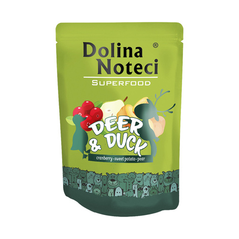 jeleń 40% (mięso 20%, płuca, wątroba), kaczka 40% (wątroba, serca, żołądki, mięso 5%), rosół, żurawina 3%, substancje mineralne, batat 1%, groszek 0,5%, gruszka 0,5%, drożdże piwne suszone 0,3% (źródło prebiotyków: mannanooligosacharydów i β-glukanów), siemię lniane 0,1%, nasiona babki płesznik, jukka Mojave, wodorosty morskie, omułek nowozelandzki zielonowargowy 0,02%, glukozamina 0,02%, siarczan chondroityny 0,02%.