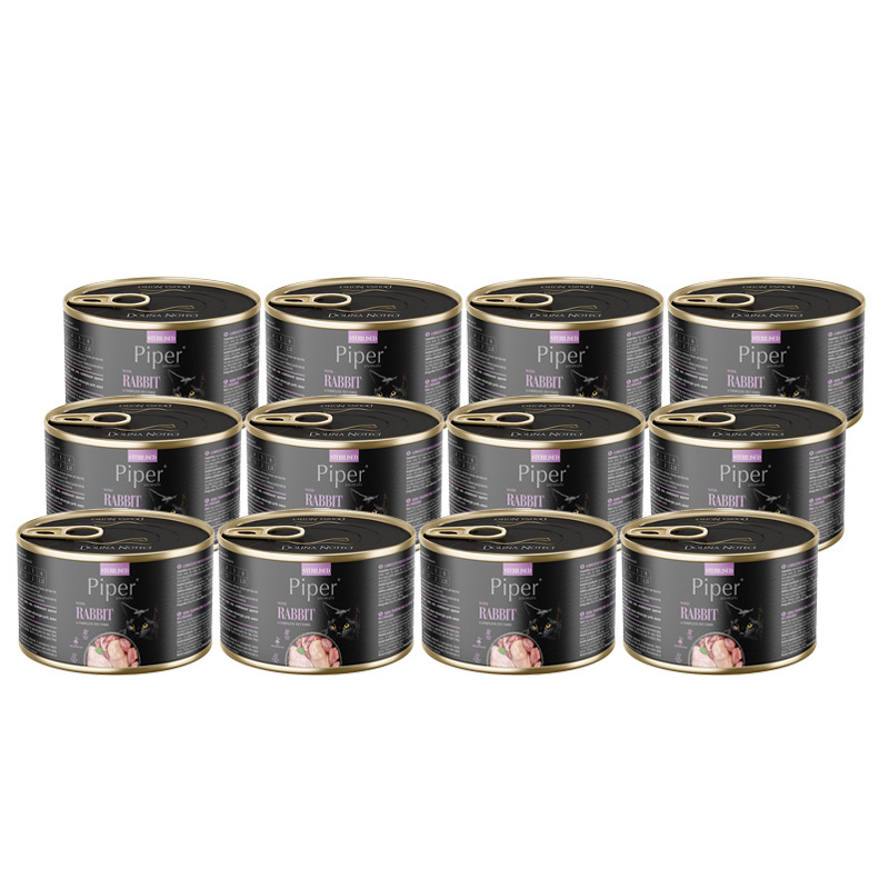 Piper z królikiem jest pełnoporcjową karmą przeznaczoną do żywienia dorosłych kotów po zabiegu sterylizacji, a poprzez swój precyzyjnie dobrany skład pokrywa ich specyficzne wymagania żywieniowe. Przede wszystkim cechuje się zmniejszoną ilością energii pochodzącej z tłuszczu. Mięso i podroby z królika dostarczają białka i wysokiej jakości tłuszczu, a kwas arachidonowy zawarty w tych surowcach sprzyja zdrowiu organizmu. Obecność w karmie fruktooligosacharydów wpływa na poprawę funkcji trawiennych, stymuluje mikrobiotę przewodu pokarmowego do wyższej aktywności metabolicznej. Olej lniany dodatkowo uzupełnia skład karmy w kwas linolenowy. Ilość tauryny pokrywa fizjologiczną normę, dzięki czemu proces trawienia tłuszczu i białek zachodzi w sposób prawidłowy. W karmach Piper wykorzystano dodatek kocimiętki, która charakteryzuje się wysokimi walorami zapachowymi, zwiększając atrakcyjność karmy, a poprzez obecność lotnych olejków eterycznych wpływa na poprawę funkcji trawiennych przewodu pokarmowego. Dobrze zbilansowany stosunek wapnia do fosforu pomaga utrzymać równowagę mineralną i zdrowe kości.Jod, cynk i witamina E stymulują metabolizm organizmu kota sterylizowanego, a babka płesznik pobudza uczucie sytości. Dzięki temu mokra karma Piper jest odpowiednim produktem dla kotów po zabiegu sterylizacji, wyjątkowo smacznym i zdrowym.
