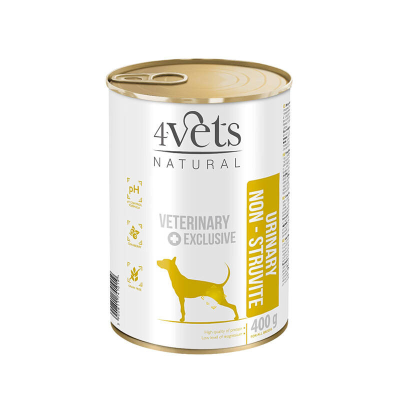 Dieta weterynaryjna 4vets Urinary Non-struvite to pełnoporcjowa dietetyczna karma dla psów ze schorzeniami dróg moczowych. Wspiera proces leczenia zapalenia pęcherza i kamieni struwitowych dzięki obniżonej zawartości magnezu, białka oraz właściwościom zakwaszającym mocz. Dieta może stanowić element profilaktyki po ustąpieniu dolegliwości. Zawiera niską zawartość sodu i potasu, co pozytywnie wpływa na funkcjonowanie nerek, a także przyspiesza rozpuszczanie zalegających kamieni.
