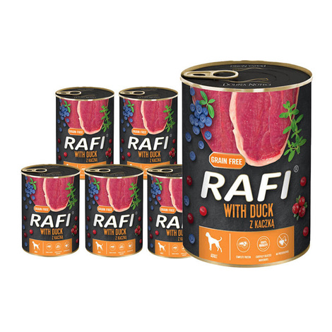 Ta mokra karma Rafi, dzięki wykorzystaniu mięsa i surowców pochodzenia zwierzęcego z kaczki, jest źródłem pełnowartościowego białka zawierającego wszystkie aminokwasy egzogenne. Dodatkowo wysoka zawartość aminokwasów deficytowych (szczególnie siarkowych) zmniejsza konieczność ich uzupełniania poprzez produkty zbożowe. Karma z kaczką zawiera selen, miedź i żelazo w odpowiednich proporcjach, pokrywając w ten sposób dzienne zapotrzebowanie dorosłego psa. Szczególnie ważnymi składnikami obecnymi w mięsie i surowcach pochodzących z kaczki są kwasy tłuszczowe z rodzin n-6 i n-3, które regulują pracę układu trawiennego. Dodatek tymianku wpływa na zwiększenie walorów zapachowych i smakowych karmy oraz wspiera funkcje trawienne. Borówka chroni organizm przed działaniem wolnych rodników, a żurawina zapobiega infekcjom układu moczowego.