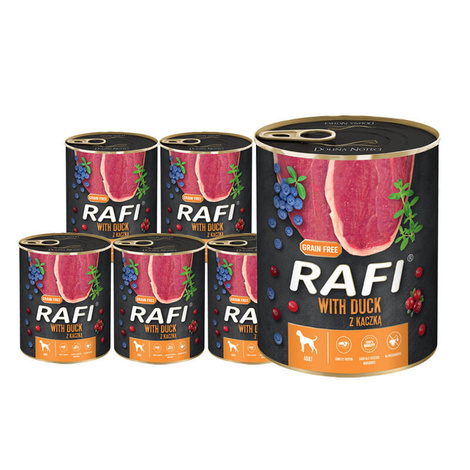 Ta mokra karma Rafi, dzięki wykorzystaniu mięsa i surowców pochodzenia zwierzęcego z kaczki, jest źródłem pełnowartościowego białka zawierającego wszystkie aminokwasy egzogenne. Dodatkowo wysoka zawartość aminokwasów deficytowych (szczególnie siarkowych) zmniejsza konieczność ich uzupełniania poprzez produkty zbożowe. Karma bezzbożowa z kaczką zawiera selen, miedź i żelazo w odpowiednich proporcjach, pokrywając w ten sposób dzienne zapotrzebowanie dorosłego psa. Szczególnie ważnymi składnikami obecnymi w mięsie i surowcach pochodzących z kaczki są kwasy tłuszczowe z rodzin n-6 i n-3, które regulują pracę układu trawiennego. Dodatek tymianku wpływa na zwiększenie walorów zapachowych i smakowych karmy oraz wspiera funkcje trawienne. Borówka chroni organizm przed działaniem wolnych rodników, a żurawina zapobiega infekcjom układu moczowego.