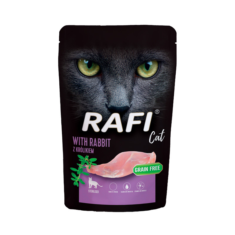 Bezglutenowamięso i produkty pochodzenia zwierzęcego 55% (mięso z królika 4%), oleje i tłuszcze (olej lniany 0,6%, olej z łososia 0,5%), produkty pochodzenia roślinnego (skrobia grochowa, sproszkowany sok z buraka), substancje mineralne, tymianek suszony 0,01%.