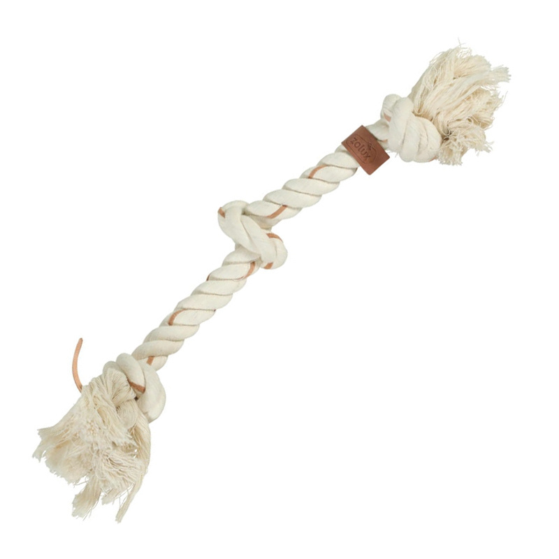 Bawełniany sznurek jest delikatny dla dziąseł, a paski skóry bydlęcej zapewniają większy opór i naturalny zapach, który stymuluje psa do długotrwałej zabawy.