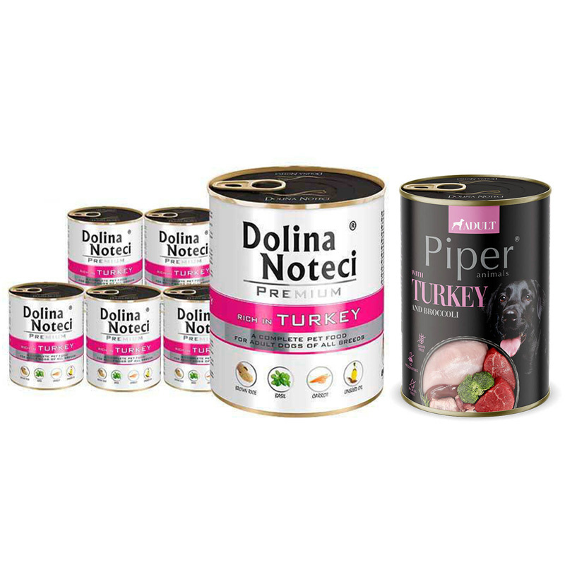 Mokra karma dla psa Dolina Noteci Premium bogata w indyka zestaw 6 x 800 g + Piper Animals z indykiem i brokułem 400 g Gratis