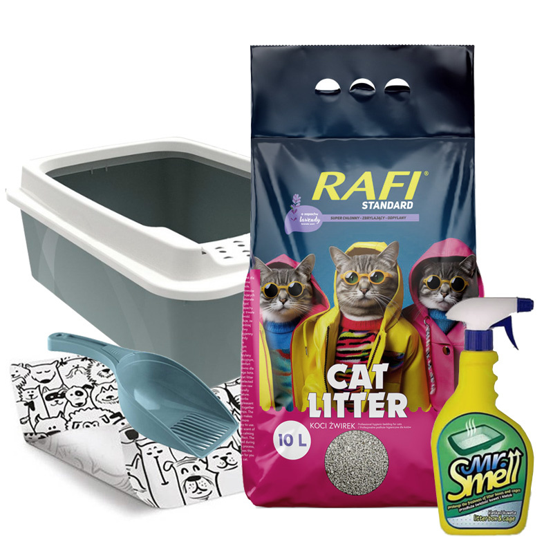 - Zestaw Kącik Czystości: kuweta Rotho, żwirek Rafi, odświeżacz Mr. Smell, łopatka Zolux, podkładka Dolina Noteci
