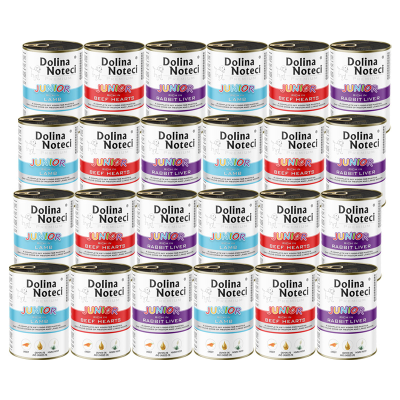 Dolina Noteci Premium junior bogata w serca wołowewołowina 30% (serca 15%, płuca, żołądki, mięso), kurczak 25% (wątroba, mięso, żołądki, skórki), wieprzowina 20% (mięso, wątroba, nerki), rosół, jaja 5%, marchew 2%, substancje mineralne, drożdże piwne suszone 0,2% (zawierające prebiotyki: MOS oraz beta-glukany), olej z łososia 0,15%, olej lniany 0,1%, nasiona babki płesznik 0,1%, jukka Mojave 0,02%.