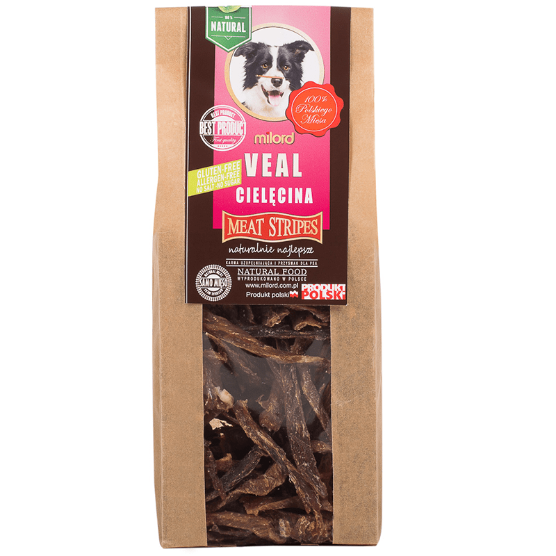 Każda chwila jest dobra na rozpieszczanie swojego pupila, by to zrobić podaj mu przysmak dla psa z cielęciny w formie pasków marki Milord. Smakołyk, dzięki swojej strukturze i elastyczności, jest szczególnie polecany dla szczeniąt, a także dla psów małych i średnich ras. Specjalna obróbka, za pomocą ciepłego powietrza w niskiej temperaturze, pozwoliła na zachowanie zawartych w cielęcinie składników odżywczych, minerałów i witamin, co sprawia, że produkt pozytywnie wpływa na układ trawienny i metabolizm. Wysoka zawartość białka powoduje, że przysmak może być stosowany jako dodatek uzupełniający codzienną dietę. Przysmak produkowany jest w Polsce, a w jego recepturze znajduje się tylko mięso z łopatki, karkówki i łaty cielęcej, bez dodatku konserwantów, wypełniaczy i barwników. Oznacza to, że przekąska jest w 100% bezpieczna dla każdego psa.