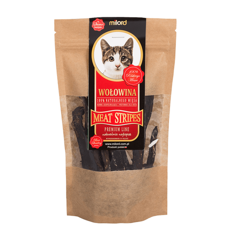 Naturalny przysmak twardy dla kota wołowina paski Koty, tak jak i psy, muszą zaspokoić swoją potrzebę gryzienia, na co pozwala przysmak dla kota wołowina w paskach marki Milord. Cienkie paseczki podczas żucia przyczyniają się do dbania o higienę zębów i dziąseł, redukując kamień nazębny i wzmacniając dziąsła. A tłuszcze i witamina A i D3 pozytywnie wpływają na kondycję skóry i sierści. Przekąska wyprodukowana została w Polsce, w 100% z mięsa wołowego i nie zawiera żadnych konserwantów, barwników ani wzmacniaczy smaku i aromatu. Dzięki temu jest odpowiednia dla kotów w każdym wieku i kondycji.