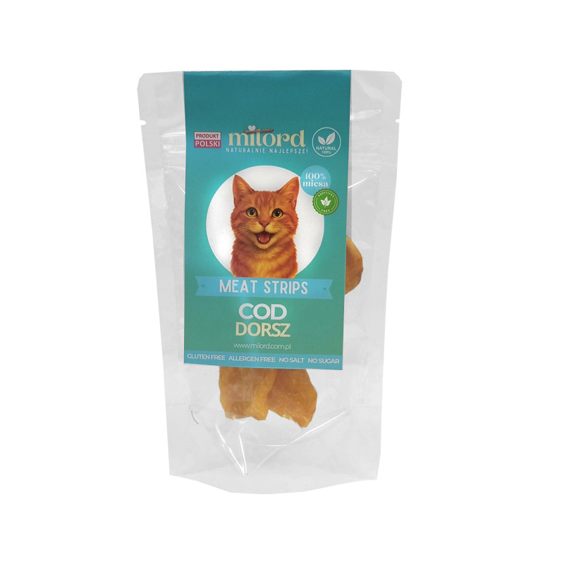 Naturalny przysmak twardy dla kota dorsz paski Delikatne mięso ryb polecane jest dla alergików, z tego powodu przysmak dla kota z dorsza marki Milord jest tak lubiany przez czworonogi z wrażliwym układem pokarmowym. Mięso poddawane jest procesowi suszenia ciepłym powietrzem, co pozwala na zachowanie jego wszystkich wartości odżywczych, a w szczególności witamin A, E i D3 oraz kwasów tłuszczowych n-3 i n-6. Kwasy EPA i DHA wpływają pozytywnie na cały organizm, w szczególności wykazują działanie przeciwzapalne, regulują ciśnienie i wspierają odporność. Przekąska może stanowić uzupełnienie codziennej diety i jest w 100% bezpieczna dla kotów w każdym wieku. Oznacza to, że do jej produkcji użyte zostało wyłącznie ręcznie wyfiletowane mięso z najsmaczniejszej części dorsza - podbrzuszy, bez dodatku barwników, konserwantów czy wzmacniaczy smaku i aromatu.
