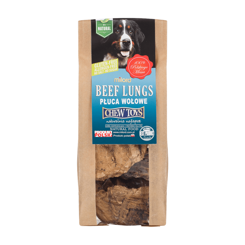Płuca wołowe poddane odpowiedniej obróbce - suszenia za pomocą ciepłego powietrza, stanowią wyśmienity, aromatyczny i odpowiednio twardy przysmak dla psa. Niezależnie od wagi, wielkości i rasy pupila z pewnością zajmą go na dłuższy czas. Gryzak został wyprodukowany z polskiej wołowiny, jest bezpieczny gdyż nie zawiera konserwantów, barwników ani wzmacniaczy smaku i aromatu. Produkt jest bardzo wytrzymały, nie pęka i jest w całości trawiony przez psa. Odpowiednia struktura gryzaka, pomaga zniwelować kamień nazębny i dba o kondycję dziąseł, jednocześnie zaspokajając potrzebę żucia i gryzienia.