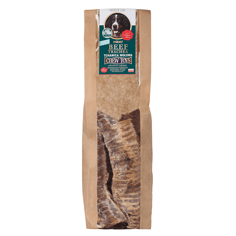 Suszony gryzak dla psa z tchawicy wołowej marki Milord to naturalny smakołyk, który zaspokoi potrzebę żucia każdego psa. Charakteryzuje się wysoką zawartością naturalnego kolagenu. Jest idealny dla dużych psów oraz tych z problemami stawowymi, dysplazją i innymi chorobami stawów. Produkt wytworzony w Polsce z tchawic wołowych polskiego pochodzenia. Suszenie ciepłym powietrzem w niskich temperaturach zapewnia całkowite bezpieczeństwo. Dzięki temu do produktu nie dodaje się barwników, konserwantów i wzmacniaczy smaku czy aromatu.