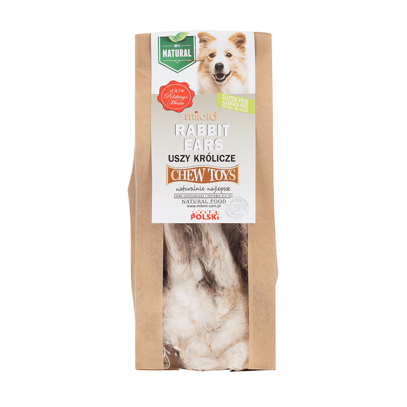 Suszone uszy królicze z futrem to wyjątkowo atrakcyjny gryzak dla psa. Są sprężyste i ciągnące, dzięki czemu pupil z chęcią się nimi zajmuje. Dodatkowo to jedna z hipoalergicznych przekąsek, która jest bezpieczna niemal dla każdego psa. Suszone uszy z futrem zaspokajają bardzo ważną potrzebę żucia oraz pomagają utrzymać prawidłowy stan uzębienia. Gryzaki są suszone ciepłym powietrzem w niskich temperaturach, co zapewnia bezpieczeństwo epidemiologiczne, bez konieczności użycia środków chemicznych i konserwujących. Zostały wyprodukowane z uszu króliczych polskiego pochodzenia.