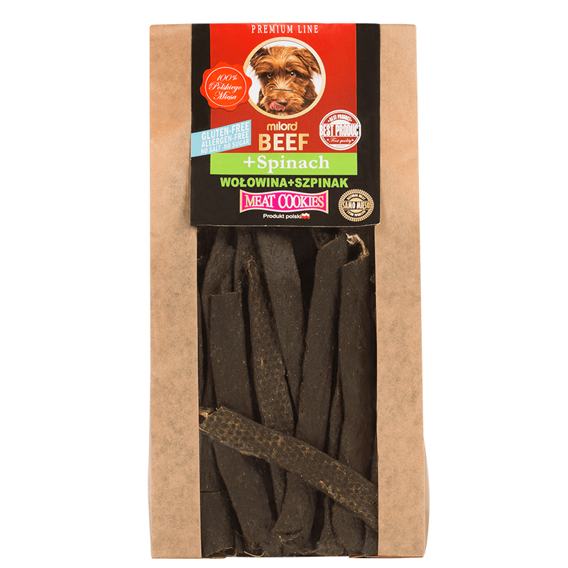Zdrowy skład i przepyszny smak gwarantują ciastka dla psa z wołowiną i szpinakiem. To świetna przekąska bogata w luteinę oraz kwas foliowy, który wzmacnia układ krążenia. Przysmaki powstają w procesie suszenia, dzięki temu nie zawierają mąki ani jakichkolwiek innych dodatków. Są kruche i łatwo podzielne, dzięki czemu starczają na dłużej. Przysmaki są suszone ciepłym powietrzem w niskich temperaturach, co zapewnia bezpieczeństwo epidemiologiczne, bez konieczności użycia środków chemicznych i konserwujących. Zostały wyprodukowane z surowców polskiego pochodzenia. Produkt nie zawiera: gliceryny, konserwantów, wzmacniaczy smaku i aromatu ani wypełniaczy.