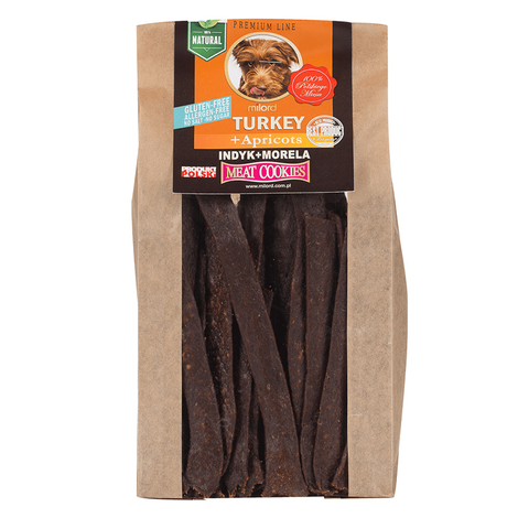 Naturalny przysmak z indyka i moreli to propozycja dla czworonogów lubiących zdrowe i smaczne przekąski. W swoim składzie zawiera wyłącznie mięso oraz owocowy dodatek. Ciastka powstały w procesie suszenia, dzięki temu są kruche, a w ich składzie nie ma mąki. Przysmaki suszone są ciepłym powietrzem w niskich temperaturach, co zapewnia bezpieczeństwo epidemiologiczne, bez konieczności użycia środków chemicznych i konserwujących. Zostały wyprodukowane z surowców polskiego pochodzenia. Produkt nie zawiera: gliceryny, konserwantów, wzmacniaczy smaku i aromatu, wypełniaczy.