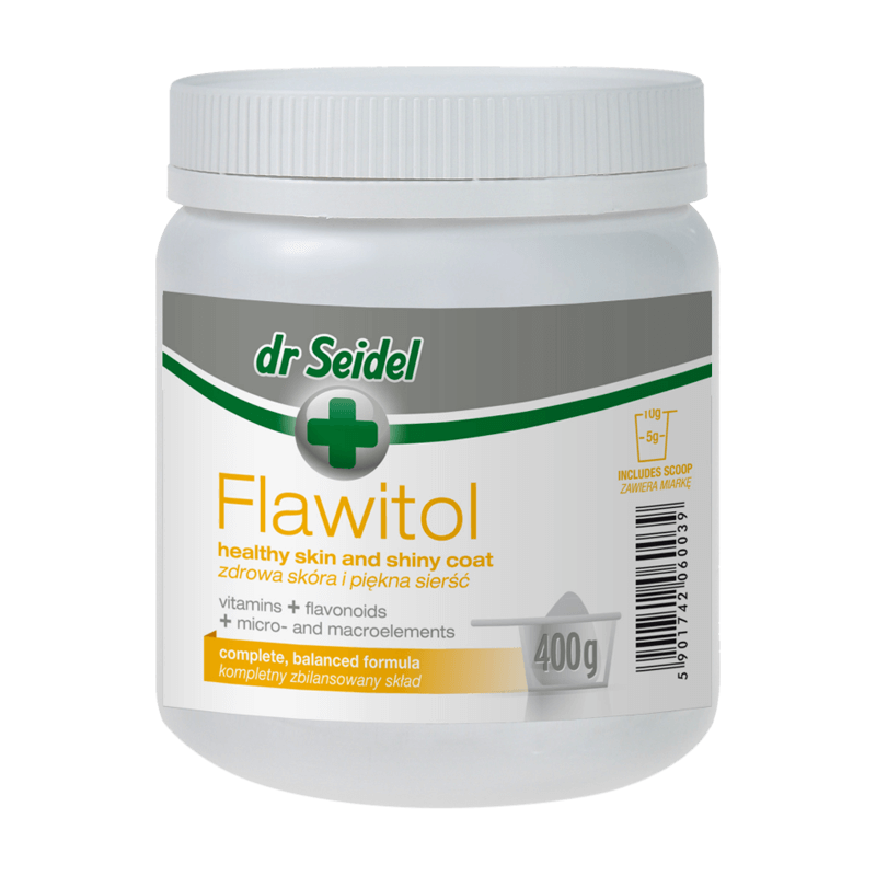 Flawitol zdrowa skóra i piękna sierść – zapewnia prawidłowy stan skóry, dzięki zawartości cynku, biotyny, kwasu pantotenowego oraz witamin A i E. Dodatek flawonoidów w preparacie zwiększa odporność organizmu na wiele chorób (w tym nowotworowych) i opóźnia procesy starzenia. Zapobiega wysuszeniu i nadmiernemu łuszczeniu się skóry. Daje piękną, błyszczącą sierść.