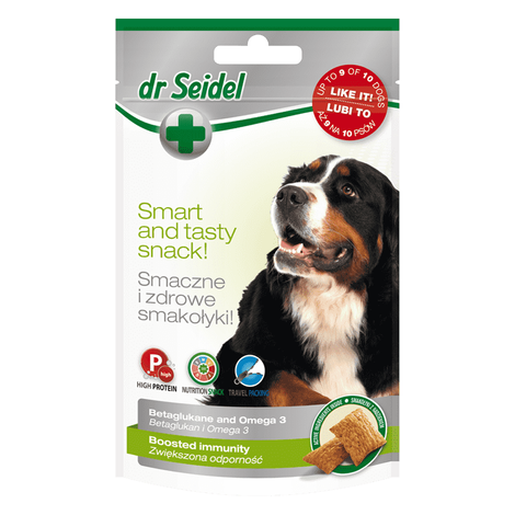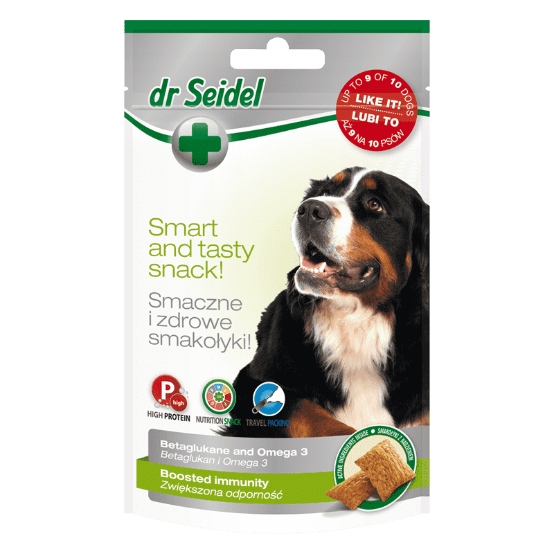 Jedyny na rynku przysmak dla psów wzbogacony o ß-1,3/1,6-D-glukan i Omegę 3 w ilościach odpowiadających suplementom diety. ß-1,3/1,6-D-glukan wzmacnia naturalną odporność organizmu przeciwko infekcjom, wspomaga proces regeneracji i gojenia, a także skraca okres rekonwalescencji. Omega 3 pobudza naturalne mechanizmy chroniące organizm przed procesami zapalnymi.