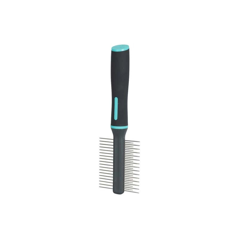 GRZEBIEŃ DWUSTRONNY - Grzebień dwustronny delikatnie rozczesuje, usuwa martwy podszerstek i wygładza sierść. Strona z szeroko rozstawionymi zębami rozczesuje i wygładza sierść, zapobiegając powstawaniu kołtunów. Zaokrąglone na końcach zęby chronią skórę zwierzęcia przed podrażnieniem.