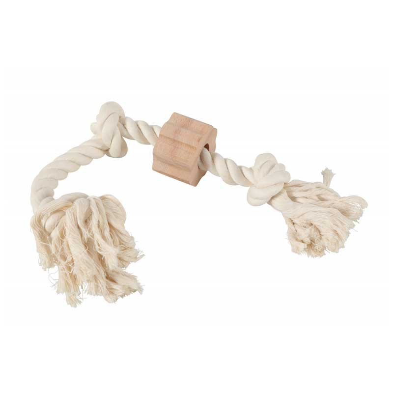 Sznury bawełniane lub bawełniano-lniane posiadają wykonane z drewna bukowego pierścienie. Produkty sprzyjają utrzymaniu odpowiedniej higieny jamy ustnej i gwarantują świetną zabawę.