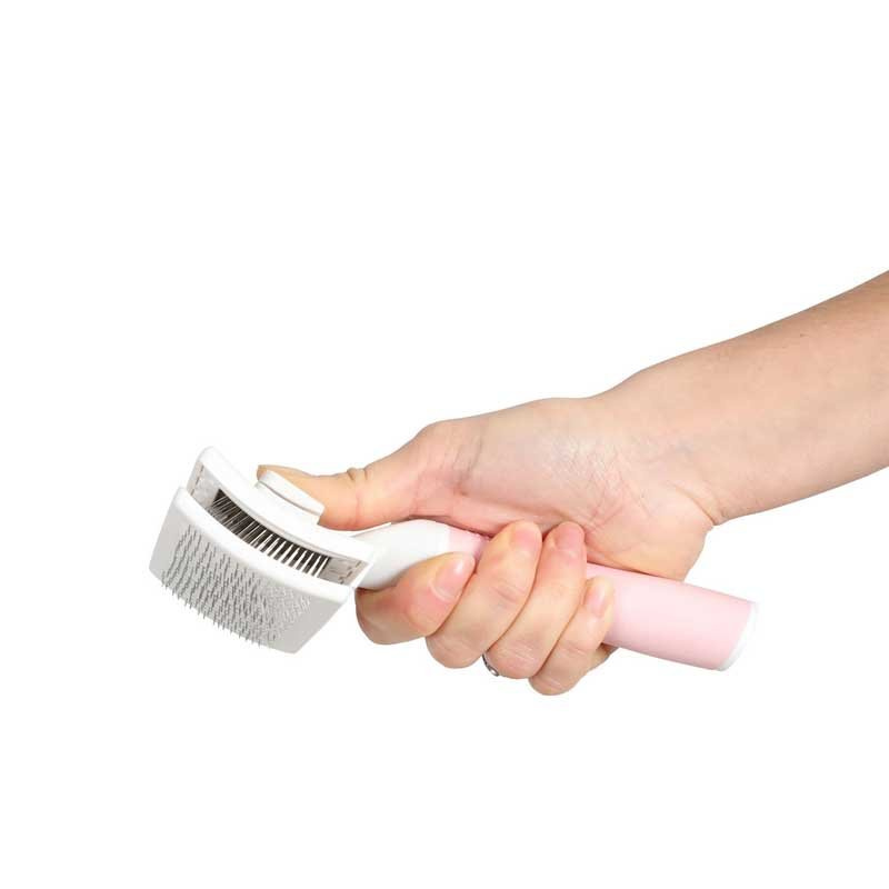 SZCZOTKA Z WYSUWANYMI IGŁAMI DLA KOTÓW MAŁA - Elastyczne, zakrzywione igły umożliwiają delikatne szczotkowanie podszerstka. Dzięki wysuwanym igłom, szczotka jest wygodna w użyciu i łatwa do utrzymania w czystości. Rozczesuje, usuwa martwy podszerstek i wygładza sierść