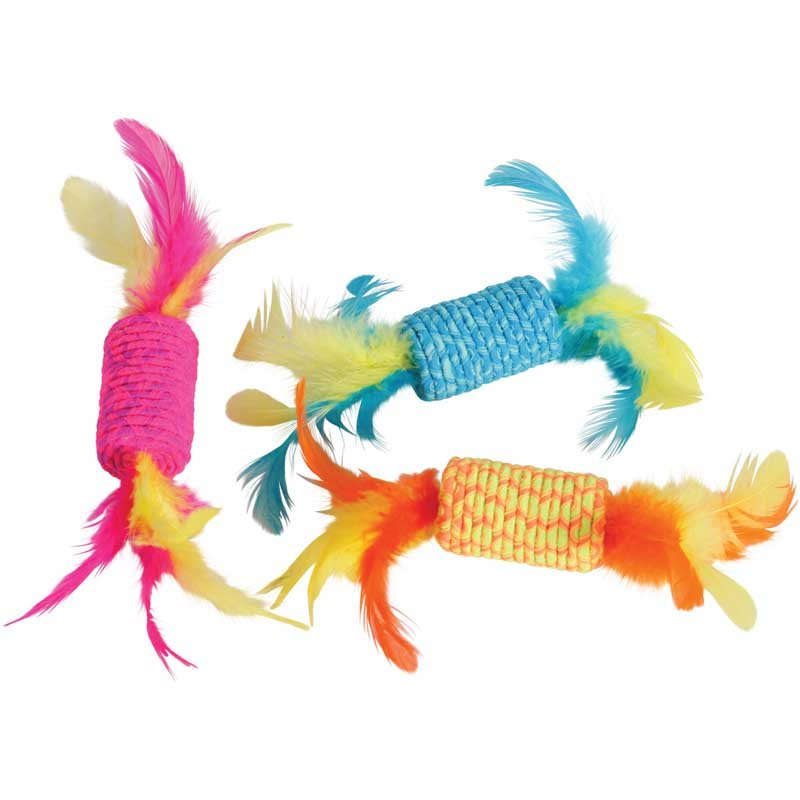 Zabawka w kształcie cukierka z piórkami to odpowiedź na niespożytą chęć zabawy Twojego kota. Nawinięty spiralnie sznurek jest odporny na zadrapania i pazury. Koty uwielbiają gonić, polować i podrzucać swoją zdobycz. Nietuzinkowa zabawka zapewni wielogodzinne harce Twojemu kotu. Piękne kolory i solidne wykonanie! Długość zabawki: 5 cm sam cukierek + po 5 cm piórek z każdej strony. Kolor wysyłamy losowo.