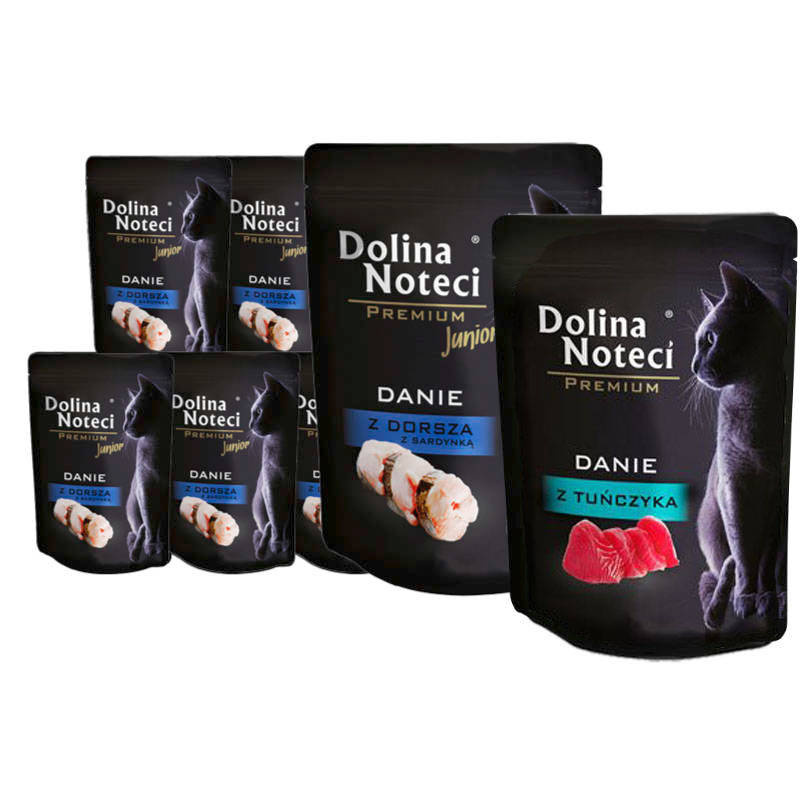 Mokra karma dla kota Dolina Noteci Premium Junior danie z dorsza z sardynką zestaw 10 x 85 g + danie z tuńczyka 85 g gratis