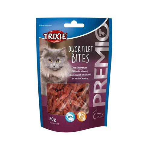 Przysmak Trixie Premio Duck Bites to suszone mięso kaczki cechujące się wysoką zawartością białka zwierzęcego, dzięki czemu jest to niezwykle smakowita przekąska dla Twojego kota. Mięso stanowi aż 72% składu produktu. Przysmak występuje w formie drobno krojonych pasków co ułatwia porcjowanie. Przekąski Trixie pakowane są w szczelny strunowy worek, dzięki czemu dłużej zachowują świeżość i niezwykły aromat.