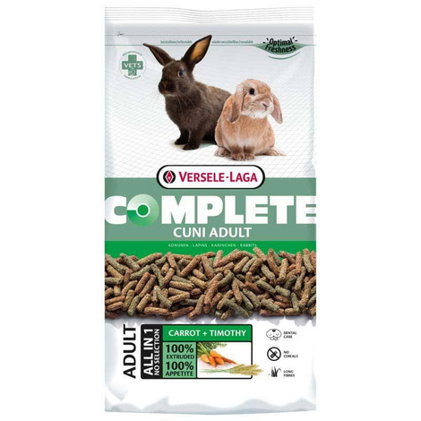 Versele-Laga Complete Cuni Adult to żywienie bez zmartwień. Niezwykle smaczne ekstrudaty przygotowane wg koncepcji "wszystko w jednym" zapobiegają selektywnemu pobieraniu pokarmu. Dzięki temu Twój królik otrzymuje wszystkie niezbędne substancje odżywcze pozwalając mu cieszyć się pełnią zdrowia. Bezzbożowy, zawierający długie włókna pokarm dostosowany jest do potrzeb żywieniowych dorosłych królików. Versele-Laga Complete Cuni Adult został przygotowany przez lekarzy weterynarii w oparciu o zaawansowane badania.