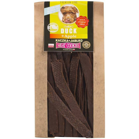 Wyjątkowy przysmak dla psa Milord kaczka z jabłkiem zawiera aż 75% mięsa z kaczki. Bogaty w białko produkt wzbogacony został o jabłko, które stanowi pozostałe 25% receptury. Dzięki temu przysmak zawiera przeciwutleniacze, które zapobiegają nowotworom, opóźniają starzenie, regulują pracę nerek, ciśnienie i trawienie. Ponadto jest ono źródłem potasu, wapnia, żelaza, fosforu i witamin z grupy B,C i PP. Błonnik zawarty w dodanym do smakołyka jabłku wspiera procesy trawienne i usprawnia metabolizm. Przysmaki Milord są wyjątkowo kruche i aromatyczne. Nie zawierają konserwantów, barwników ani polepszaczy smaku. Ze względu na brak glutenu mogą spożywać go również psi alergicy.