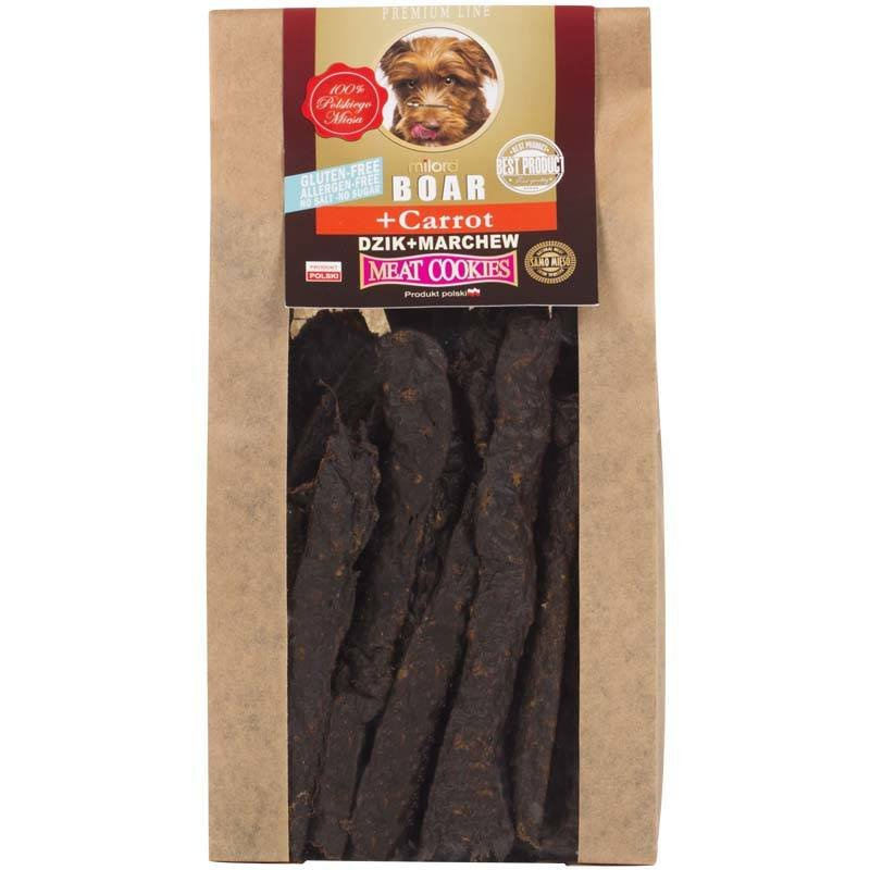 Naturalne ciastka Milord z mięsem z dzika i marchewką to bezglutenowe, wolne od cukru i soli przysmaki, które zasmakują niejednemu psu. Ręcznie robione, bez zbędnych konserwantów, barwników i wzmacniaczy smaku. W ich skład wchodzi aż 75% mięsa, a dopełnienie stanowi marchewka (25%). Dzięki specjalnemu procesowi suszenia produkt zachowuje wszystkie swoje wartości odżywcze, witaminowe i mineralne. Marchewka bogata jest w beta-karoten, luteinę i przeciwutleniacze, dzięki czemu doskonale wpływa na wzrok oraz hamuje rozwój infekcji.
