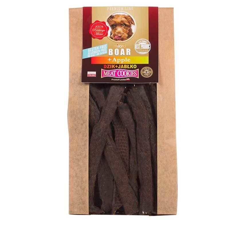 Wyjątkowy przysmak dla psa Milord dzik z jabłkiem zawiera aż 75% mięsa. Bogaty w białko produkt wzbogacony został o jabłko, które stanowi pozostałe 25% receptury. Dzięki temu przysmak zawiera przeciwutleniacze, które zapobiegają nowotworom, opóźniają starzenie, regulują pracę nerek, ciśnienie i trawienie. Ponadto są one źródłem potasu, wapnia, żelaza, fosforu i witamin z grupy B,C i PP. Błonnik zawarty w dodanym do smakołyka jabłku wspiera procesy trawienne i usprawnia metabolizm. Przysmaki Milord są wyjątkowo kruche i aromatyczne. Nie zawierają konserwantów, barwników ani polepszaczy smaku. Ze względu na brak glutenu mogą spożywać go również psi alergicy.