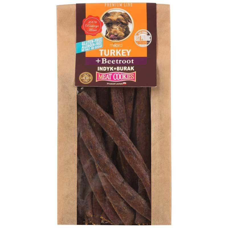 Warto urozmaicić codzienną dietę pupila i podać mu ciastka dla psa Milord z indykiem i burakiem. Ich zbilansowany skład, w który wchodzi aż 75% mięsa i 25% dodatku warzywnego, to źródło białka i szeregu witamin oraz minerałów. Dzięki temu przekąska wspomaga pracę układu pokarmowego i sercowo-naczyniowego, a jednocześnie pozytywnie wpływa na skórę i sierść. Bezpieczny proces produkcji, jakim jest suszenie ciepłym powietrzem, a także brak konserwantów, wzmacniaczy smaku i aromatu, czy glutenu w składzie sprawiają, że przysmak jest odpowiedni nawet dla psów z alergiami.