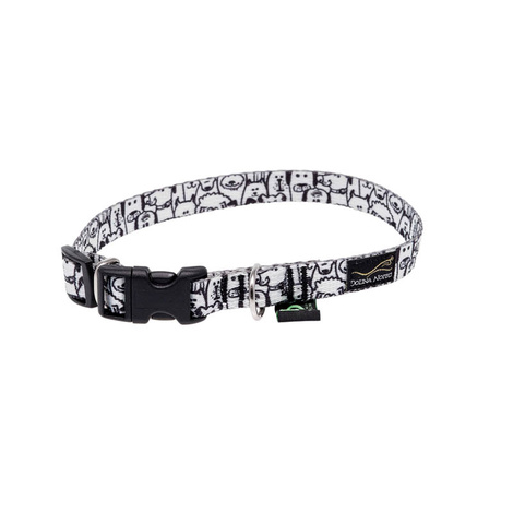 Tradycyjna obroża zapinana plastikową, mocną klamrą. Wykonana z dwustronnej, odpornej na zaciągnięcia taśmy w rysunkowy wzór. Klasyczna biel i czerń to wybór dla każdego psa, który kocha prostotę i minimalizm. Jedynym elementem zdobienia jest zielona naszywka z logiem marki Dolina Noteci. Doskonale pasuje do smyczy w ten sam deseń, również dostępnych w naszym sklepie Obroża jest regulowana, zapinana na plastikowy zatrzask co pozwala na idealne dopasowanie do szyi psa. Bezapelacyjną zaletą produktu jest niewielka waga. Obroża doskonale prezentuje się zarówno na psach ras mniejszych jak i dużych. Daje gwarancję bezpieczeństwa i niepowtarzalnego wyglądu naszego czworonoga. Świetnie sprawdza się także u młodych, często bardzo niecierpliwych psów, dla których codzienne zakładanie obroży trwa zawsze zbyt długo. Obroża nie wyciera oraz nie kołtuni sierści psa. Materiał, z którego jest wykonana jest bardzo wytrzymały, odporny na rozerwanie oraz zmienne warunki atmosferyczne, nie jest podatny na odkształcenia czy odbarwienia. Ubłocona, zanieczyszczona obroża po spacerze? Wystarczy ją przepłukać lub przetrzeć wilgotną szmatką by usunąć wszelkie zabrudzenia. Kolory nie blakną, dzięki czemu jest to obroża, która posłuży wiele lat.