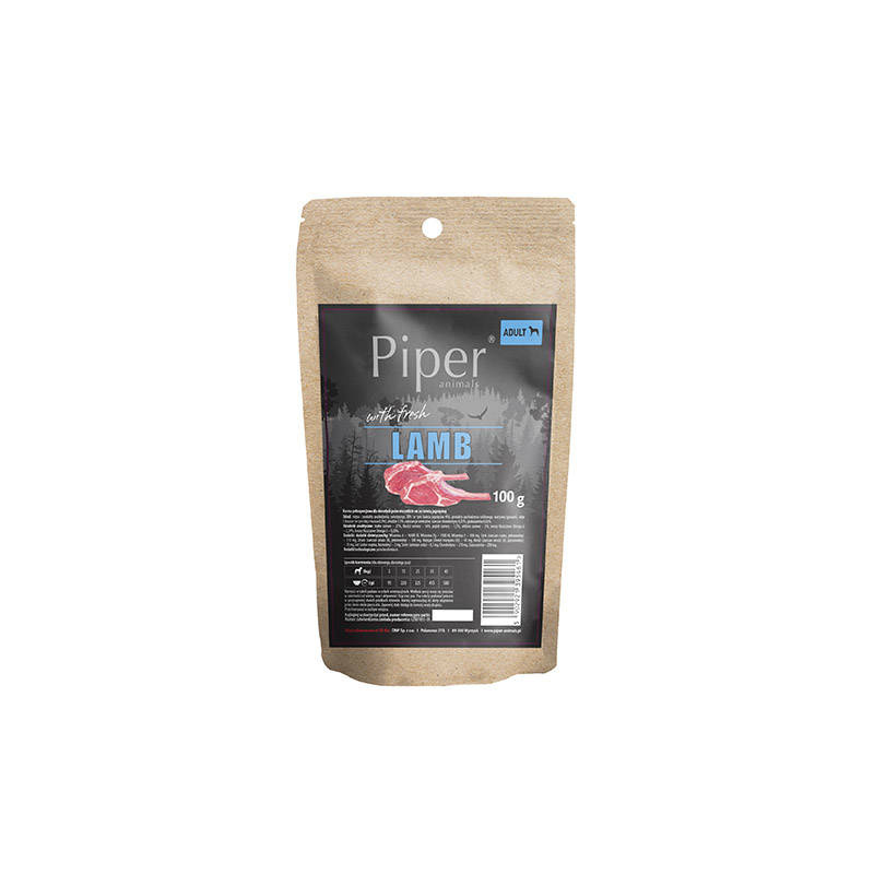 PIPER ANIMALS z jagnięciną uwzględnia składniki odżywcze niezbędne do zachowania zdrowia i dobrej kondycji dorosłego psa. Zastosowanie surowców pochodzenia zwierzęcego – w tym świeżej jagnięciny – dostarcza zarówno wysokiej jakości pełnowartościowego białka, jak i kwasów tłuszczowych. Karma sucha Piper Animals z jagnięciną pokrywa zapotrzebowanie na pozostałe substancje odżywcze, mineralne i witaminowe w codziennym żywieniu psa. Wapń zapewnia prawidłowe funkcjonowanie układu kostnego. Dodatek substancji chondroprotekcyjnych: glukozaminy i chondroityny utrzymuje stawy psa w odpowiedniej formie, chroniąc przed zmianami towarzyszącymi procesowi starzenia się. Groszek i drożdże regulują prawidłową pracę przewodu pokarmowego.
